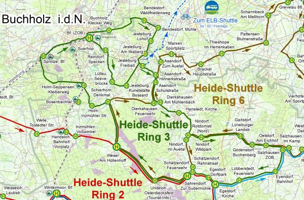 Ab Buchholz startet der Heide-Shuttle 3 als Ringlinie über die Ortschaften Reindorf, Lüllau, Bendestorf, Jesteburg, Asendorf, Dierkshausen, Hanstedt, Nindorf, Garlstorf, Gödenstorf, Oelstorf, Salzhausen, Eyendorf, Lübberstedt, Egestorf, Schätzendorf, Sahrendorf, Undeloh, Wesel, Schierhorn, Holm, Holm-Seppensen, Sprötze zurück nach Buchholz.