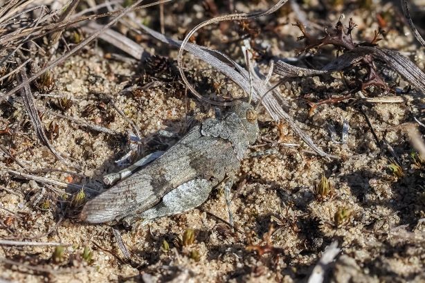 Die Blauflügelige Ödlandschrecke (Oedipoda caerulescens) ist perfekt an karge, trockene Lebensräume angepasst. Auf offenen Sandflächen, in Heiden und auf vegetationsarmen Böden ist sie durch ihre unauffällige Färbung nahezu unsichtbar. Erst wenn man ihr zu nahekommt, zeigt sie ihr spektakuläres Geheimnis: Mit einem plötzlichen Sprung entfaltet das rund 3 cm große Insekt leuchtend blau-schwarze Flügel und fliegt davon – ein überraschender Moment für jeden Beobachter.